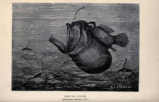 Living Lights portrays 27 instances of bioluminescence, illustrated via black and white drawings which are surprisingly effective at conjuring the illusion of light amidst the darkness. For example, Holder's illustration of an illuminated sea pen, which, when touched, emits a bright greenish light to scare off predators, highlights the minute details of this fascinating creature encapsulated within a pool of blackness interrupted only by other fellows illuminators. Or take the illustration of a diver and Pyrosomes. Pyrosomes are colonial tunicates made up of hundreds of thousands of zooids. These bioluminescent colonies emit an intense blue-green light visible for tens of meters. And, of course, a book on bioluminescence would not be complete without a depiction of the infamous anglerfish.